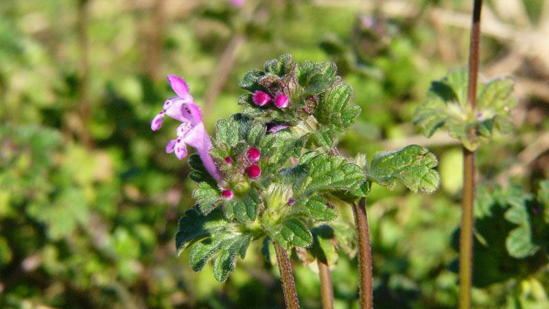 Purple Deadnettle: Purple Deadnettle (also known as red deadnettle or simply deadnettle) is also recognized by its square stem; however, its leaf margins and flowers differ from henbit.