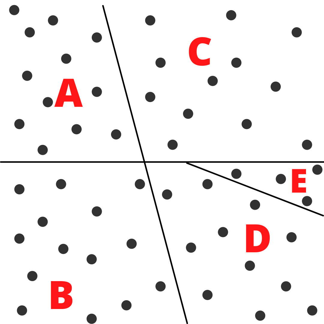 There are 5 pastures or hayfields in this example (A, B, C, D, and E). Each pasture is considered a management zone, so a total of 5 boxes would be submitted. The sample for each pasture is collected by taking a group of samples, or cores, from the pasture, which is represented by the dots on the map. Notice that cores are collected evenly throughout each area, and not in one corner or in a straight line. Collecting them randomly and throughout the entire area ensures that results are representative of the entire pasture or hayfield, instead of one corner or strip. As cores are collected in the pasture, they are placed in a clean, plastic bucket. After all cores are collected for pasture A, the soil will be mixed in the bucket. The mixed soil will be used to fill the sample box for pasture A, and the excess is discarded. This ensures that recommendations based on the sample are correct for the entire management area. The same steps are repeated for pastures B, C, D, and E.