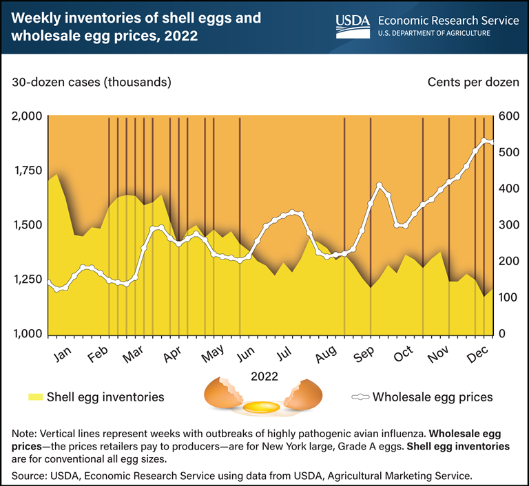 Highly Pathogenic Avian Influenza (HPAI) was detected in domestic poultry in early 2022. As the name suggests, the disease is highly infectious, and sent shockwaves through the poultry industry. Infected flocks were depopulated to prevent spread of disease, which led to decreased egg production. When combined with a slightly increased demand for eggs by consumers, this dip in production caused prices to surge. Unfortunately, consumers are now feeling the impact of HPAI at the grocery store. Much like COVID-19, HPAI is here to stay, and the industry is adapting to this change. Consumers will likely feel relief as egg production returns to pre-HPAI levels.