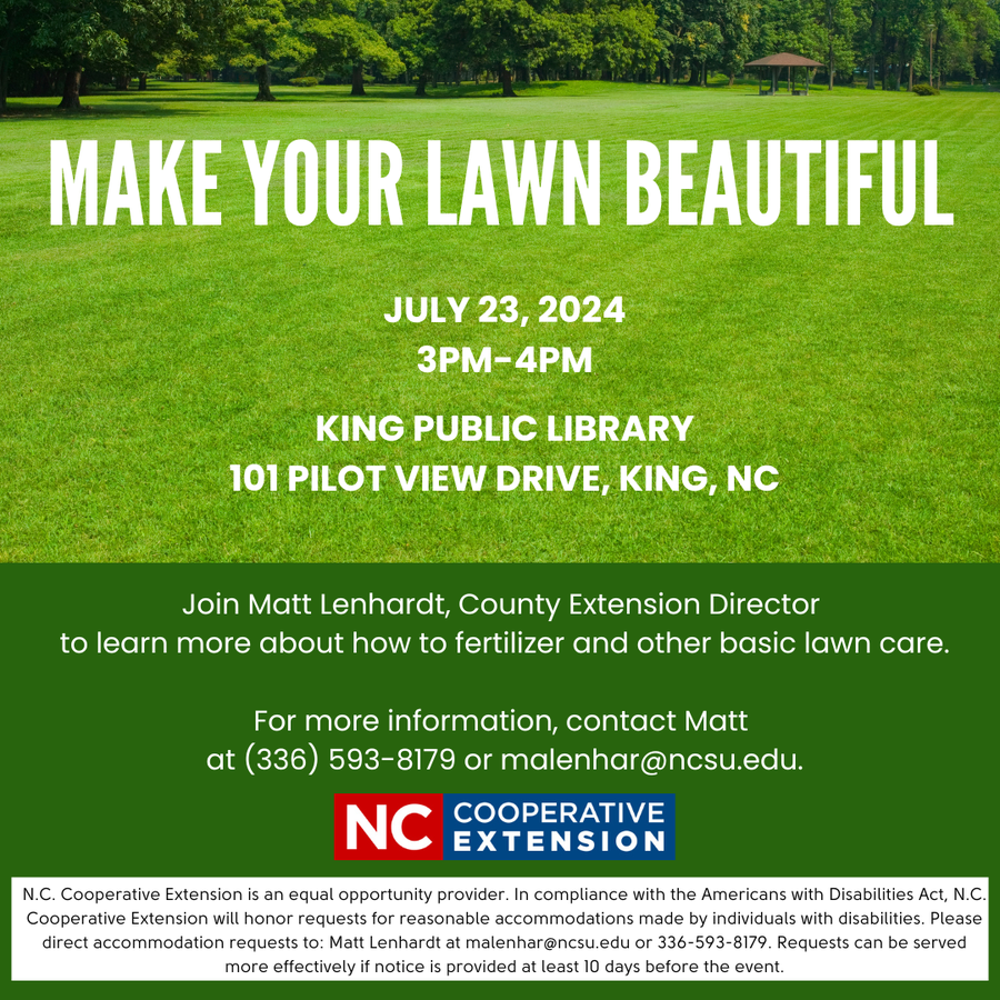 Join Matt Lenhardt, County Extension Director, on July 23, 2024 from 3pm -4pm at the King Public Library to learn about fertilizer and other basic lawn care.