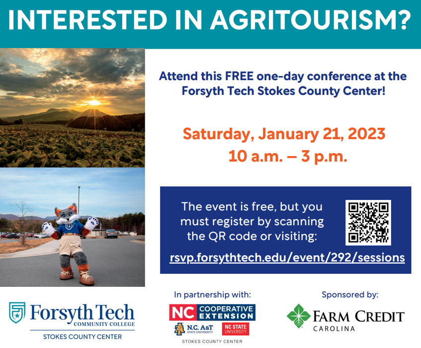 N.C. Cooperative Extension, Stokes County Center in partnership with Forsyth Tech Community College, Stokes County Center is excited announce our second annual Stokes County Agritourism Conference. Join us on Saturday, January 21st from 10am - 3pm at Forsyth Tech Community College, Stokes County Center. This event is free thanks to Carolina Farm Credit and the Small Business Center at Forsyth Tech. Come enjoy sessions such as food regulation and food safety for value-added products, farm accounting, niche meat marketing, and accessing capital for your agritourism business.